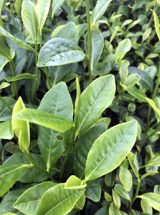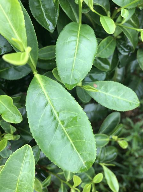 【性狀特征】樹姿半開張,分枝較密。葉片呈半上斜狀著生,橢 服形,葉色綠,有光澤,葉面平展,葉身平,,葉緣平,葉尖漸尖,葉脈11對,鋸齒37對,葉質較厚軟。花瓣白色、5瓣,尊片5枚,柱頭3裂。產量高,4~6齡茶園僅春季每667m'可產鮮葉1030kg。春季萌發早。2010年和2011年在長沙縣高橋鎮觀測,一芽二葉初展期分別為4月3日和3月27日,分別比福鼎大白茶早1天和6天。芽葉生育力和持嫩性強,淺綠色,茸毛較多,一芽二葉百芽重20.3g。