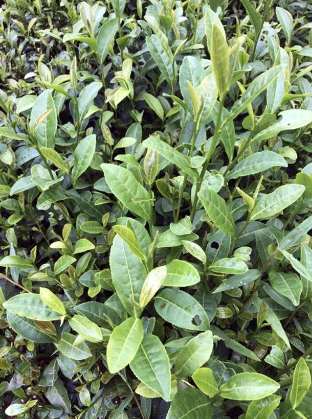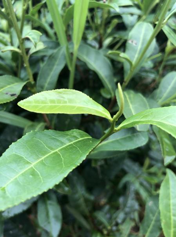 無(wú)性系。屬灌木型、中葉類、早生種。植株樹(shù)姿半開(kāi)張,分枝密,葉姿上斜。葉片呈長(zhǎng)橢圓形,葉尖較鈍,葉面微隆起,葉色黃綠,富光澤,葉肉較薄,葉質(zhì)柔軟,側(cè)脈明顯,鋸齒較粗、整齊,葉緣微波,芽葉纖細(xì),色黃綠,嫩葉背卷。開(kāi)花結(jié)實(shí)率一般。扦插成活率較高。發(fā)芽較早,春芽萌發(fā)期在3月中旬,一芽三葉盛期在4月中旬;發(fā)芽密度大,育芽力強(qiáng),芽葉纖細(xì),葉色黃綠,葉片薄,葉質(zhì)軟,茸毛多。一芽三葉百芽重29.7克。