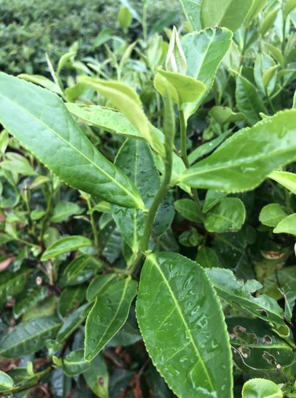 半喬木型,大葉類(lèi)。樹(shù)姿半開(kāi)張,葉片上斜著生,橢圓形,葉色綠有光澤,葉面隆起,葉基楔形,葉身內(nèi)折;芽葉肥壯,呈黃綠色,茸毛多;一芽二葉百芽重約49克,一芽三葉百芽重約103克。花冠淺黃色,子房多毛,花柱3裂。2008 年~2010 年多點(diǎn)適驗(yàn),發(fā)芽期平均較對(duì)照福鼎大白茶早3~5天,鮮葉平均畝產(chǎn)量 400.98 公斤,比對(duì)照福鼎大白茶高 23.21%。