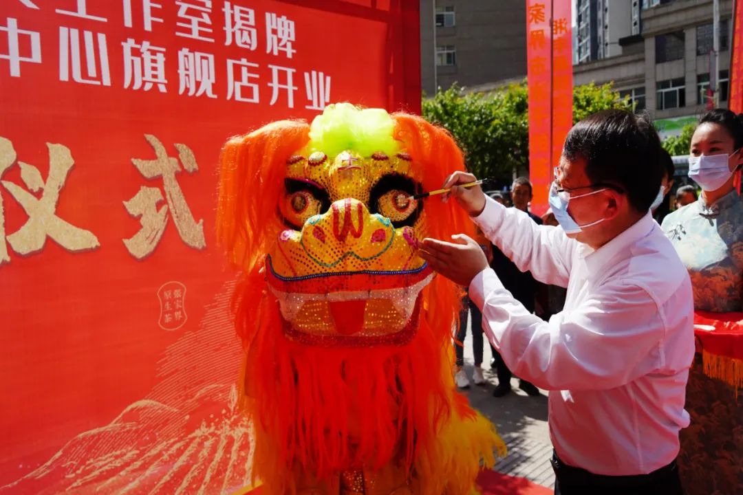 隨后,一陣鏗鏘有力、熱鬧非凡的鑼鼓響起,兩頭金獅在場上翻騰起舞,精彩的舞獅表演將現場的氣氛推向了高潮,吸引了眾多市民駐足觀賞。李中欽先生與湯程霖先生一同為金獅點睛,寓意湘豐桑植白茶行政中心旗艦店鴻運當頭,開業大吉。